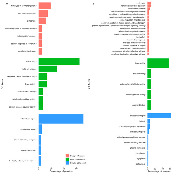 Gene ontology analysis disclosed a pattern of proteins related to toxin and other venom components (Figure 2). Even though the most frequent GO terms were “toxin activity” and “extracellular region”, differences were identified between the two different extracts. The GO term “calcium channel regulator activity” was highlighted in the proboscis, as it was related to GLTx and other toxins such as cysteine-rich venom proteins as well as omega-hexatoxin. Furthermore, “phosphoric diester hydrolase activity” and ”metalloendopeptidase activity” were also noteworthy, as they related to dermonecrotic toxins (sphingomyelinase D) and venom metalloproteinases M12B (Table S2). When only considering the proteins in common between the proteomes of the two organs, the proteins identified were related to biological processes, such as biosynthesis of toxins, immune response and proteolysis (Figure S2). Moreover, when considering all proteins found in the proboscis (Figure S3A), there was a link with biological processes such as “hemolysis in another organism”, “proteolysis” and “inflammatory response”, while in the skin (Figure S3B), proteins were chiefly related to “inflammatory response”, “proteolysis” and “complement activation, classical pathway”.