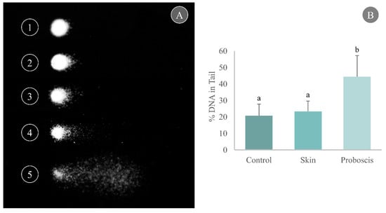 Cell harvesting from gills yielded good-quality nucleoids for the comet assay with a unimodal distribution per slide, thus indicating reduced influence of necrotic and apoptotic cells (Figure 4A). Gill cells exposed to the skin crude protein extract for 10 min attained a maximum mean of 23.4% DNA in the tail, marginally higher than the control (20.7% DNA in the tail). On the other hand, exposure to the proboscis extract for 10 min caused a significant increase in the percentage of damaged DNA in mussel gills, reaching a maximum mean of 44.3% DNA in tail (Dunn’s test, p < 0.05, Figure 4B).