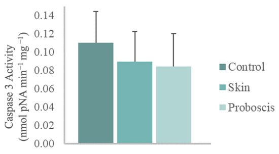 The 10 min ex vivo exposure to the crude protein extract (1 mg total protein mL−1) from G. alba’s proboscis yielded a mean caspase-3 activity of 0.085 nmol pNA min−1 mg−1 in mussel gill cells. In turn, gills exposed to the skin extract for the same duration and total protein concentration attained a mean caspase-3 activity of 0.09 nmol pNA min−1 mg−1. However, no significant differences relative to control gills (mean caspase-3 activity of 0.11 nmol pNA min−1 mg−1) were found (Figure 5).