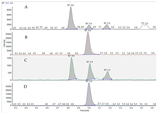 Triple quadrupole mass spectrometric analysis of BMAA in an impinger air sample from the Great Salt Lake in comparison with a BMAA standard. The air sample was taken at site 7 (see Figure 1) in October 2023. (A), Air sample TIC at m/z 459.2 (double derivatized AQC-BMAA, AEG and DAB); (B), Air sample TIC at m/z 464.25 (AQC-derivatized internal BMAA standard); (C), standard TIC at m/z 459.2 (double derivatized AQC-BMAA, AEG and DAB); (D), standard TIC at m/z 464.25 (AQC-derivatized internal BMAA standard).