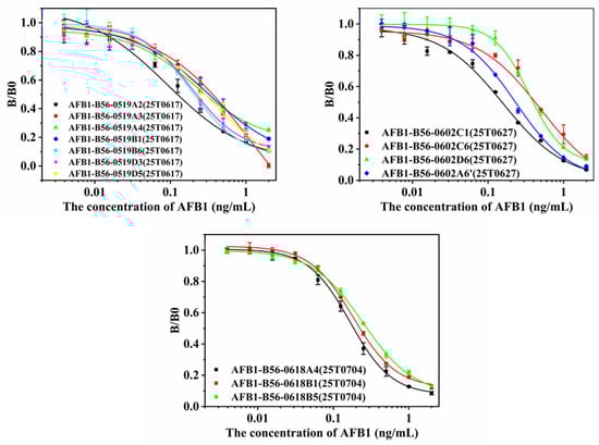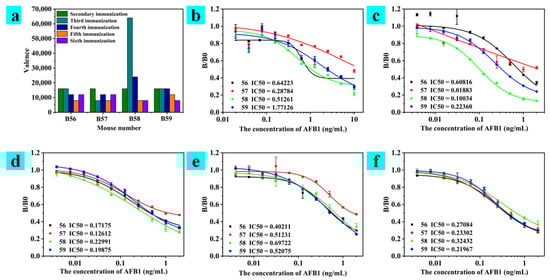 The serum indirect ELISA test data of mice after different immune time are shown in Figure 1. The B0 value was the absorbance value detected at 450 nm for the reaction solution without AFB1 for indirect ELISA detection, the B value was the absorbance value detected at 450 nm for the reaction solution with AFB1 for indirect ELISA detection, and the B/B0 value is the absorbance ratio with and without AFB1. As the number of immunizations increased, the mouse spleen cells became more mature. In the early stages of immunization, the immune system of mice produced IgM antibodies with a high splicing value but a short half-life. Therefore, in the early stages of immunization, the potency of the mouse serum assay was higher. Membrane-bound monomeric IgM (mIgM) antibodies were the hallmark of immature B cells. With repeated immunizations, the mouse immune system responded again by secreting IgG-type antibodies with a longer half-life, and the serum potency (Figure 1a) and specificity of the mice to the target object (Figure 1b–f) were also improved. After repeated immunizations, the spleen cells of mice matured to form large numbers of B cells. Immature B cells express only mIgM, while mature B cells may express both mIgM and mIgD, and were referred to as initial B cells. In the serum test after the last immunization, the titers of the mice were all above 16,000 (Figure 1a), among which the potency of B56 and B57 were 32,000, and of B59 and B57 were 16,000. Serum titers met the requirements of cell fusion. B56 and B57 mice had already reached 32,000 by the sixth immunization, but combined with the trend of previous serum potency changes, B56 mice were more in line with the trend of antibody potency changes. Their IC50 in the competition test was also pretty good. Their IC50 levels in the competition test were also positive, ranging from 0.2–0.35 ng/mL in the sera of all mice examined, as shown in Figure 1f. The inhibition curve of mouse B57 did not visually show a promising trend of inhibition in previous immunizations. The final ranking of the immunization effect of this mouse was B59, B56, B58, B57.