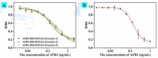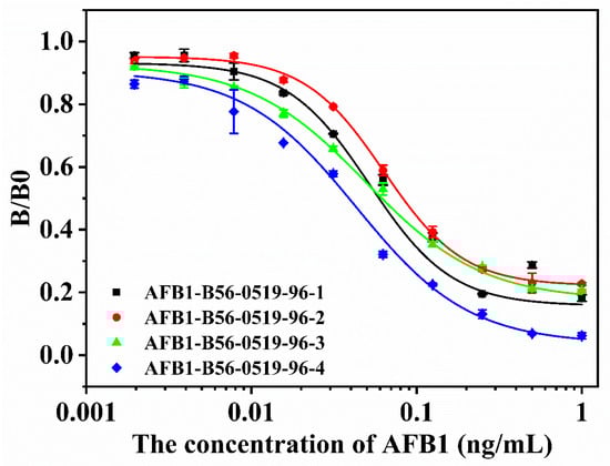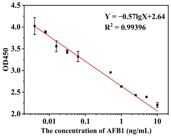 The sensitivity of MBs-icELISA to AFB1 was studied under optimal conditions. With the increase in the AFB1 concentration, the absorbance value of the sensor decreases gradually, as shown in Figure 11. MBs-icELISA had a good linear relationship in the concentration range of 0.004~10 ng/mL, and the linear range covers five orders of magnitude. The detection limit (LOD) for AFB1 was 0.0013 ng/mL. The results showed that the prepared monoclonal antibody had a good application prospect and showed good sensitivity and a wide recognition range when combined with MBs-icELISA.