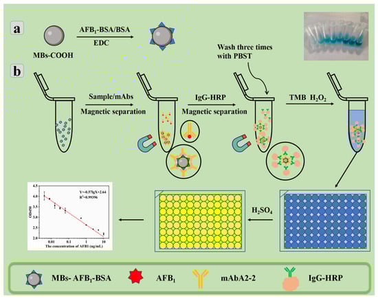Schematic diagram of MBs-icELISA detection process based on dynamic pseudo-homogeneous magnetic bead competition. (a) MBs-AFB1-BSA preparation process. (b) The mechanism of MBs-AFB1-BSA detection of aflatoxins, using the different absorbance of the reaction solution at 450 nm for quantitative analysis.