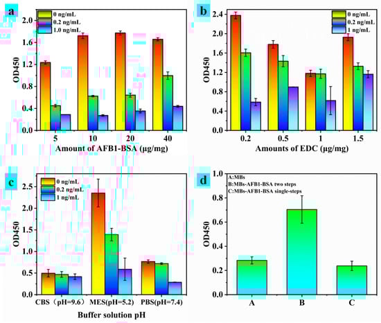Absorbance at 450 nm of MBs-icELISA of MBs-AFB1-BSA obtained via different (a) concentrations of AFB1, (b) amounts of EDC, (c) pH and (d) steps.