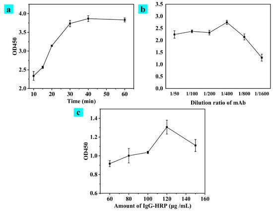 In addition to the effect of the feeding amount during MBs-AFB1-BSA coupling, the numbers of reagents added during the reaction affected the sensitivity of MBs-icELISA. Therefore, the incubation time of mAbA2-2 and the amount of mAbA2-2 and IgG-HRP used were optimized, and the results of each optimization are shown in Figure 10. Firstly, the incubation time of mAbA2-2 increased gradually with the increase in the OD450 value over 5–30 min, and the OD450 value gradually stabilized after 30 min; the results are shown in Figure 10a. The incubation time of 30 min mAbA2-2 was selected. Secondly, mAb, as the most essential recognition element of MBs-icELISA, de-termined the sensitivity of the sensor; with the rise in mAb, OD450 gradually increased, reaching 1:400 after a stable trend. These results are shown in Figure 10b. Finally, the amount of IgG-HRP affected the colorimetric response of MBs-icELISA; too little IgG-HRP affected the sensor and the upper limit of detection, too much produced waste, and the amount of IgG-HRP was optimized with the purpose of conservation. The optimal amount of IgG-HRP was 120 μg/mL, as shown in Figure 10c.