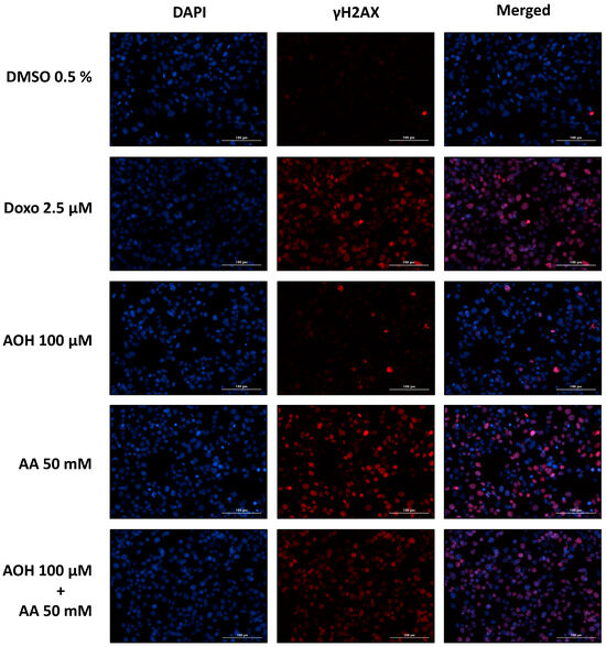 The genotoxic effects exerted by AOH, AA, and their respective combinations on HepG2 cells were assessed by conducting a γH2AX assay. In particular, the same incubation conditions used to assess the impact of the food contaminants on cell viability were applied for the genotoxicity assessment (see Section 2.1). Representative pictures of cells exposed to the controls (0.5% DMSO and 2.5 µM Doxo) and to some selected single and combined treatments (100 µM AOH, 50 mM AA, 100 µM AOH + 50 mM AA) in the absence of metabolic activation are shown in Figure 2.