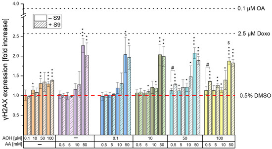 γH2AX expression induced by AOH and AA as single compounds and in combination. HepG2 cells were exposed to the various conditions for 4 h (in presence and absence of metabolic activation). Results are shown as fold increases over the solvent control (0.5% DMSO). Each condition was tested with at least three technical and three biological replicates. Okadaic acid (0.1 µM) and Doxo (2.5 µM) were used as positive controls for treatments with and without S9 fraction, respectively. One-way ANOVA with Fisher’s LSD post-hoc test was applied to determine statistical differences between the various treatments and the solvent control, with * p < 0.05, ** p < 0.01, and *** p < 0.001. Significant differences between single and combined treatments, as well as between treatments with and without metabolic activation were evaluated by applying the Student’s t-test. $ indicates a significant difference (p < 0.05) between the co-treatments and the respective concentration of AA, while # indicates a significant difference (p < 0.05) between the treatments with and without metabolic activation.