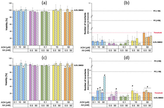 Cytotoxic and mutagenic effects exerted by AOH, AA, and their binary combinations on the Salmonella typhimurium strains TA98 and TA100 in the presence and absence of metabolic activation. (a,b) report the viability and mutagenicity results (respectively) obtained from the exposure of TA98 strain to the test compounds and their combinations for 90 min. (c,d) report the viability and mutagenicity results obtained in the TA100 strain. Viability results are expressed as mean value (+SD) of the optical densities of three biological replicates, and results were normalized to the solvent control (0.5% DMSO). The * symbol indicates a significant reduction (p < 0.05) in bacteria viability compared to the solvent control (0.5% DMSO). Mutagenicity results are expressed as fold increases over the threshold, which were calculated as two times the sum of the mean value of the solvent control plus one standard deviation. The test was considered positive when fold induction was higher than the threshold (as indicated by the # symbol).