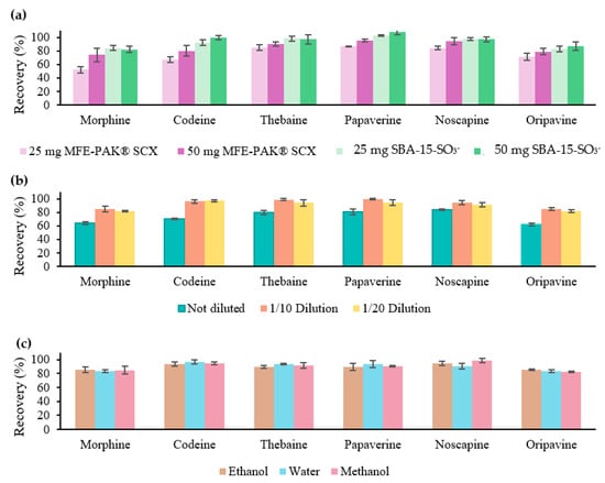 Recovery values (%) obtained with 25 and 50 mg of MFE-PAK® SCX and SBA-15-SO3− material at the same SPE conditions with standards (a). Recovery values (%) obtained with the sample extract not diluted, 1/10 dilution, and 1/20 dilution with 25 mg of SBA-15-SO3− (b). Recovery values (%) obtained with the sample extract diluted in ethanol, water, or methanol 1/10 in water with 1% HCl with SBA-15-SO3− (c).