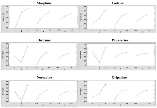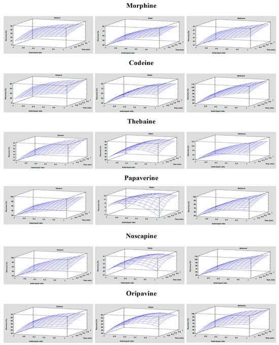 A statistical analysis (ANOVA) was carried out, and the obtained statistical parameters (R2, Adj.; R2, Pred.; and R2 and p-values) were obtained as shown in Table S2. All statistical parameters indicated that the quadratic models exhibited very high predictability, as most coefficients were close to 1. In addition, ANOVA confirmed the variables that showed statistically significant differences in the quadratic models, where values of p were lower or equal to 0.05. For the recovery of codeine, papaverine, and noscapine, the statistically significant individual variables were solvent type (A) and solid/liquid ratio (B). In the case of the recovery of morphine and oripavine, besides those two, it was also the extraction time (C). Thebaine recovery only showed differences with the solid/liquid ratio. In terms of the combinations among the variables, the ones that presented statistically significant differences were the quadratic value of the solid/liquid ratio for all analytes. For the recovery of papaverine and noscapine, it was also the combination of solvent type and solid/liquid ratio (AB). Finally, for the recovery of morphine and oripavine, the quadratic value of the extraction time (CC) also showed statistically significant differences.