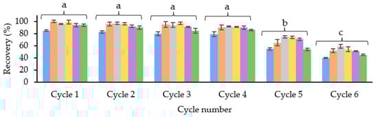 Average recovery values (%) (n = 3) obtained in each of the reuse cycles of the SPE cartridge with 25 mg of SBA-15-SO3− material. Different letters mean significant differences if p ≤ 0.05.