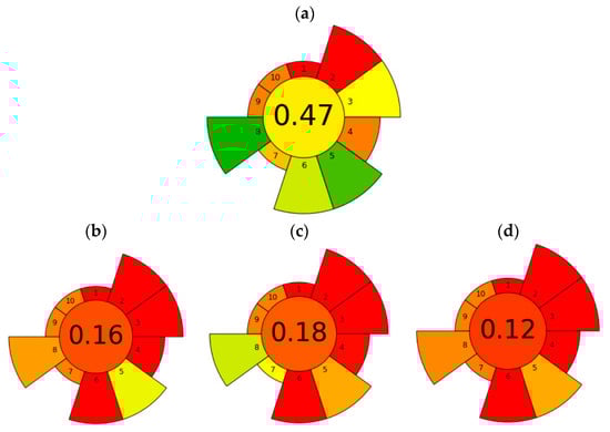 Evaluation of the greener profile of the proposed methodology in this work based on UAE-SPE-LC-MS/MS (a), a method based on SLE-MSPE-LC-MS/MS [4] (b), a method based on SLE-LC-MS/MS without the purification step [29] (c), and another method based on SLE-LC-MS/MS [32] (d) using the AGREEprep metric proposed by Pena-Pereira, Tobiszewski, Wojnowski, and Psillakis [31].