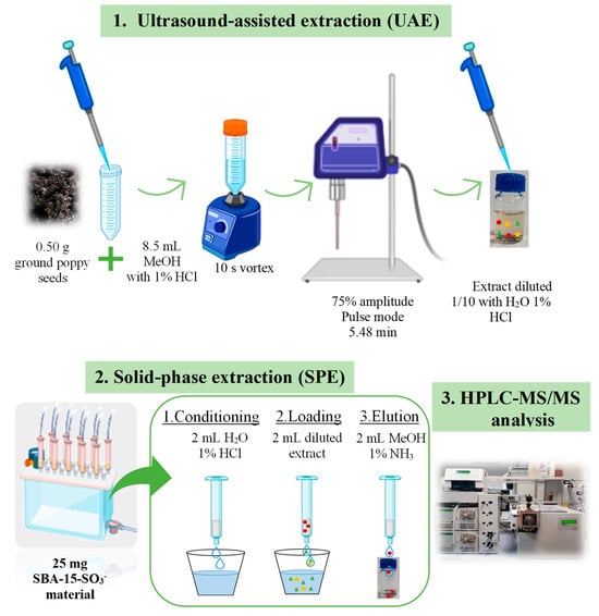 Proposed methodology diagram for the quantification of OAs in ground poppy seeds based on a UAE and an SPE for purification and analysis via HPLC-MS/MS.