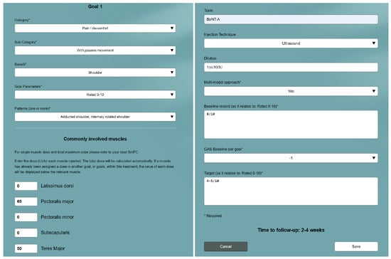 In conclusion, the GO-FAST Tool has been developed to help clinicians with patient-centred goal-setting and target muscle selection for BoNT-A treatment for post-stroke spasticity. It also provides support with the follow-up evaluation of goal attainment and calculation of treatment success. The utility of the Tool is demonstrated in a hypothetical case study for a primary goal (see Figure 2) and two secondary goals (see Figure 3). The Tool is freely available for rehabilitation clinicians to use from https://go-fast.toxnet.net, accessed on 27 November 2023.
