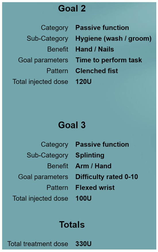 The clinical assessment identifies three goal-related spastic muscle patterns to be targeted according to patient and caregiver priorities. To increase patient and caregiver engagement with the treatment plan and the likelihood of achieving the goal, a mixture of short and long-term goals may be discussed. Once there is consensus between the patient, caregiver, and clinician on how achievable and realistic the goals are, a decision is made to treat. The patient, caregiver, and clinician agree upon one primary goal (Figure 2) and two secondary goals (Figure 3), which are classified into goal categories and subcategories using the Tool. All goals are set using the SMART goal setting algorithm. The goal categories are mapped based on the WHO ICF (International Classification of Functioning, Disability and Health) domains [11,12]. One goal parameter is chosen for measuring the expected changes and outcomes for each goal.
