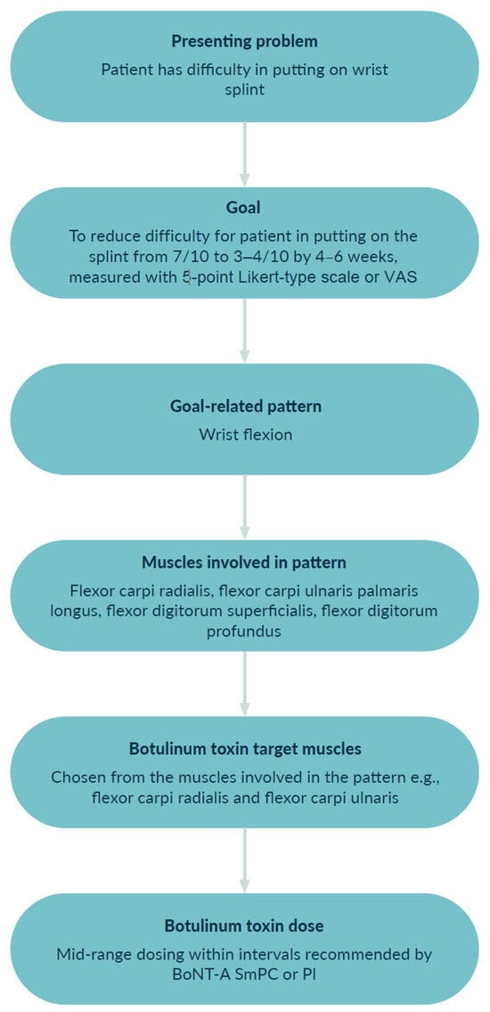 The process of target muscle selection for BoNT-A injection is outlined in Figure 4 using Goal 3 from the case study. The goal is to reduce the difficulty experienced by the patient in placing the hand splint, and the goal-related spastic pattern is wrist flexion. According to a higher probability of involvement and the low severity of increased muscle tone, only two of all possibly involved muscles, for the goal-related pattern, are chosen for injection with BoNT-A. A mid-range dosing per muscle (as documented within the Summary of Patient Characteristics for the chosen formulation of BoNT-A) is used.