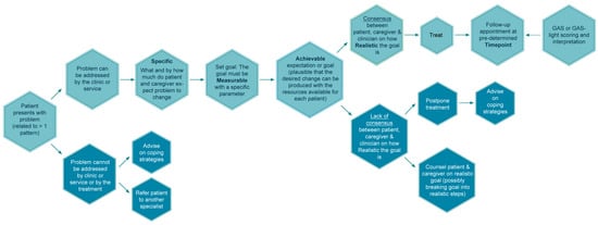 The clinician should consider whether the patient and caregiver(s) have the coping strategies, motivation, and confidence to allow for the plan to be implemented [23,24]. There must be consensus between the patient, caregiver, and clinicians on how realistic and worthwhile each goal is, so that all parties involved are committed to work towards a common end [25]. If there is consensus, a decision is made to treat, and the Goal Attainment Scale (GAS) is used to score each goal and provide the baseline GAS score.