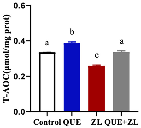 In order to further clarify that QUE has an antagonistic action on the antioxidant activity of ZEA and LPS, an assay was performed. As shown in Figure 3, the T-AOC content was significantly lower in the ZL treatment compared to that of the control group (p < 0.05). However, compared with ZL group, the addition of QUE resulted in an elevated T-AOC content after the combined ZEA and LPS combination treatment (p < 0.05).