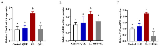 An inflammatory response often occurs in conjunction with oxidative stress. Therefore, in this study, the expression of inflammation-related genes was measured in addition to the oxidative stress detection indexes (Figure 8). The relative expression levels of NF-κB, MyD88, and TNF-α were further up-regulated in the ZL group compared to those of the control group (p < 0.05). Meanwhile, compared with the ZL group, the expressions of NF-κB, MyD88, and TNF-α were higher in the QUE+ZL group (p < 0.05).