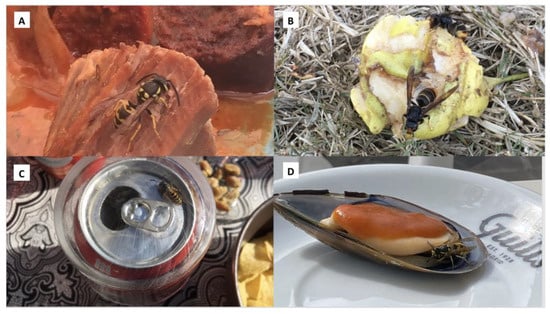 Insects and foods. (A) Vespula and meat; (B) Vespa velutina and fruit; (C) Vespula and beer; (D) Vespula and shellfish.