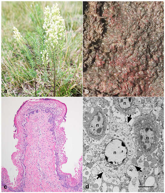 Baccharis coridifolia poisoning in early-weaned beef calves. (a) Baccharis coridifolia plant. (b) Red discoloration of the ruminal papillae. (c) Necrotic rumenitis, acute, diffuse, accentuated, with areas of detachment of the epithelial layers associated with neutrophil infiltration, H&E, 400×. (d) Epithelial cells of the rumen with marked swelling, nuclear degradation, and cellular detachment (arrows). n: nucleus. Transmission Electron Microscopy, bar = 1 μm.