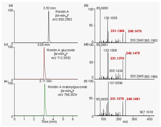Extracted ion chromatograms and their corresponding MS/MS spectra for (a,b) roridin A, (c,d) roridin A–glucoside, and (e,f) roridin A–malonylglucoside. All these compounds and other macrocyclic trichothecenes share some common fragment ions, specifically at m/z 231.1376 and 249.1481, which are shown in red text.
