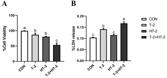 Changes in cell viability and LDH release of IPEC-J2 cells after exposure to T-2 (3.125 nmol/L), HT-2 (6.25 nmol/L), and T-2 (3.125 nmol/L) + HT-2 (6.25 nmol/L) for 24 h. (A) Cell viability; (B) lactate dehydrogenase activity. All values are given as the mean ± SD of four independent experiments. Values with different superscript letters are significantly different (p < 0.05).