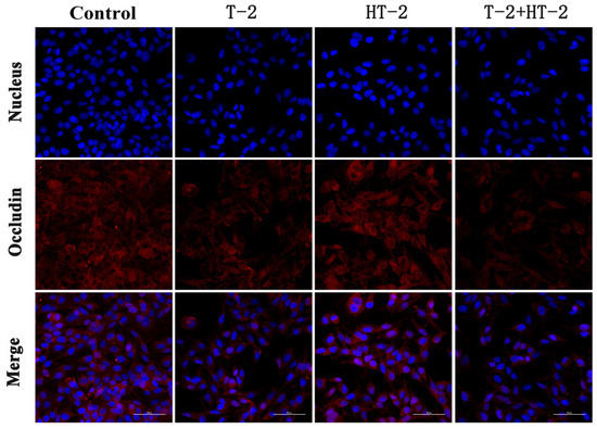 Changes in expression and distribution of Occludin protein in IPEC-J2 cells after exposure to T-2 (3.125 nmol/L), HT-2 (6.25 nmol/L), and T-2 (3.125 nmol/L) + HT-2 (6.25 nmol/L) for 24 h (400×).