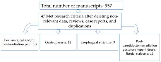 Of 957 articles found, 47 met the search criteria and underwent final analysis (Figure 1—Prisma). There were four major clinical categories comprising the effect of botulinum neurotoxins (BoNTs) on cancer-associated symptoms: 1—cancer-related pain; 2—gastroparesis caused by esophagectomy for esophageal cancer; 3—esophageal stricture after focal esophagectomy; 4—complications of parotidectomy or parotid radiation (gustatory hyperhidrosis, fistula, sialocele).