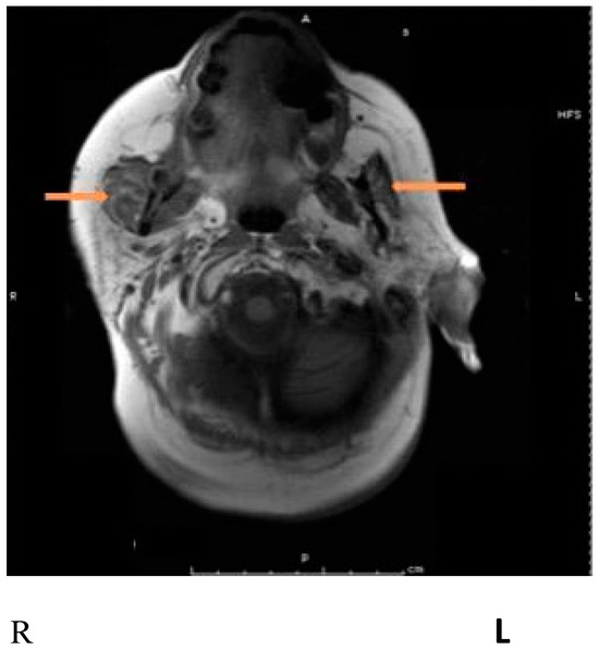 Magnetic resonance imaging (MRI) showing an enlarged masseter on the right side, probably due to metastatic involvement. Arrows pointing to the masseter muscles bilaterally. From Jabbari B. Botulinum toxin treatment of pain disorders. 2nd edition. Courtesy of publisher. Springer. Berlin, Germany [13].
