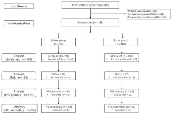 In this clinical trial, an independent statistician not directly involved in the study used SAS® 9.4 to generate a randomization table. The eligible patients were then assigned random allocation numbers at a 1:1 ratio to the Liztox® or Botox® treatment group using a stratified block randomization method. An Interactive Web Response System was utilized to assign these random allocation numbers to the enrolled subjects in the order of their registration, along with their screening numbers, serving as identifiers throughout the duration of the clinical trial. An independent pharmacist handled the dilution and drug addition into empty vials. Filled vials and syringes were delivered to the investigator in charge of administration and blinded. To maintain double blindness, we used the assignment code during randomization so that test subjects were distinguished only by the assignment code, and the assignment for each group remained confidential until the end of the clinical trial.