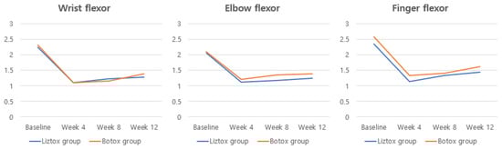 Change in the MAS scores for wrist, elbow, and finger flexor muscle tone at 4, 8, and 12 weeks (PPS).