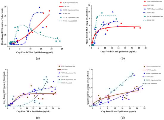 | Hill’s | Qeq = VmaxCeqn/(Kdn + Ceqn) | Vmax = maximum mycotoxin uptake Kd = dissociation constant per site (ug/mL) related to adsorption affinity n = Hill cooperativity coefficient of the binding interaction; minimum number of binding sties | [47,53,57] |