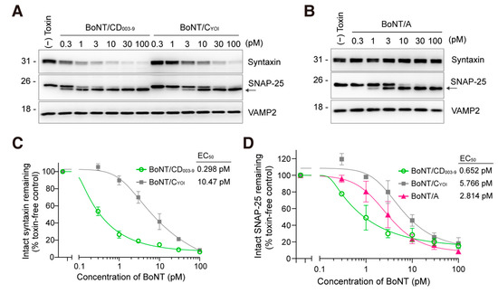 BoNT/CD003-9 is more potent than BoNT/CYOI or BoNT/A in cultured neurons. (A,B) Representative Western blot images of the SNARE protein cleavage by BoNT in cultured rat cortical neurons. Neurons were exposed to the indicated concentrations of BoNT/CD003-9, BoNT/CYOI (panel (A)), or BoNT/A (panel (B)) for 12 h. The cleavage of SNARE proteins in neuron lysate was analyzed by Western blotting. The arrow indicates the cleaved SNAP-25. VAMP2 served as a loading control. (C,D) Quantitative analysis of SNARE protein cleavage by BoNT. The band intensities were analyzed by ImageJ software. Intact syntaxin or SNAP-25 was plotted against BoNT-untreated cells (panels (C,D)). The data are means ± S.E. of three independent biological replicates.