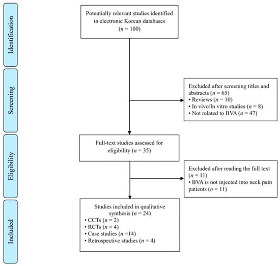 Flowchart of Korean clinical article selection process. BVA: Bee Venom Acupuncture; CCTs: Controlled Clinical Trials; RCTs: Randomized Controlled Trials.