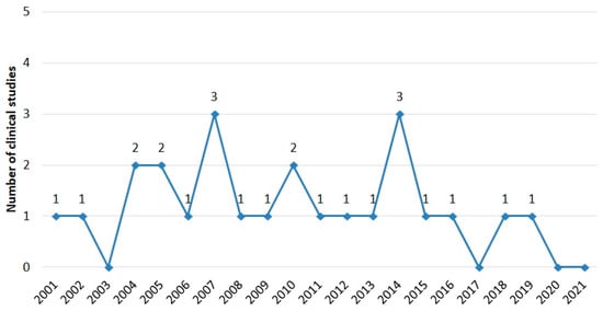 We identified 25 full-text papers [21,22,23,24,25,26,27,28,29,30,31,32,33,34,35,36,37,38,39,40,41,42,43,44] that met our inclusion criteria (Figure 1). The first clinical trial of BVA for neck pain in Korea was published in 2001. From 2001 to 2020, 0 to a maximum of 3 trials were performed each year, and no clinical trials were conducted in 2003, 2017, 2020, and 2021 (Figure 2). This report includes 14 case studies (58.3%), 2 case-controlled trials (CCTs) (8.3%), 4 RCTs (16.7%), and 4 retrospective studies (16.7%) (Table 1).