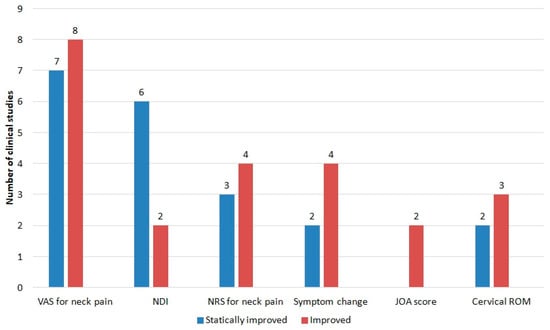 In total, 16 types of outcomes were measured in the 24 clinical studies (Table 1). The results measured by each outcome were classified into “statistically improved,” “improved,” and “not improved.” The visual analog scale (VAS) was most frequently used to assess neck pain severity (n = 15, 62.5%) (Figure 3). All evaluation tools reported “improved” or “statistically improved” outcome, and none of them reported outcomes that were “not improved.” The case studies and retrospective studies compared before and after treatments to derive statistical significance (statistical improvement). The CCTs and RCTs compared the BVA group and the control group to derive statistical significance (statistical improvement).