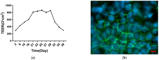 Caco-2 cells formed monolayers in 21 d on Transwell plates. TEER measurements during this process are shown in Figure 1. Caco-2 cell monolayers entered a plateau phase on day 21 that lasted until day 29, and then TEER gradually decreased. This indicates that between days 21 and 29, Caco-2 cells formed fused monolayers. After 21 d, the apparent permeability coefficient (Papp) and TEER values of the monolayers were measured to evaluate monolayer integrity. The results (Table 1) show that Papp values for Lucifer Yellow across the monolayers were less than 1 × 10−6 cm/s, and TEER values were greater than 800 Ω*cm2 after 21 d. Immunofluorescence staining (See specific protocol in Section 5.5) shows that the tight junction protein zonula occludens-1 (ZO-1) was linearly expressed after 21 d in Caco-2 cells (Figure 1b). Overall, the results indicate the establishment of Caco-2 monolayers.
