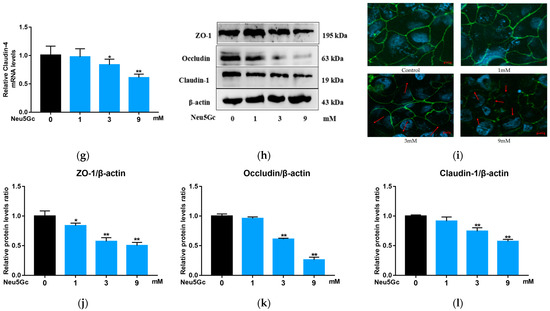 Typical tight junction proteins, including ZO-1, occludin, and claudin-1, are involved in intestinal barrier dysfunction [17]. To determine whether Neu5Gc has a destructive effect on intestinal barrier function, we evaluated the expression levels of ZO-1, occludin, claudin-1, and claudin-4 mRNA (see protocol in Section 5.10) after incubating cells with Neu5Gc (Figure 4d–g). Compared to the control group, 3 and 9 mM of Neu5Gc resulted in significantly (p < 0.05 or p < 0.01) lower mRNA expression levels of ZO-1, occludin, claudin-1, and claudin-4. Furthermore, Western blotting was conducted according to Section 5.11, and the results (Figure 4h,j–l) show that 3 and 9 mM Neu5Gc significantly (p < 0.01) reduced the expression levels of ZO-1, occludin, and claudin-1. One millimolar Neu5Gc had no significant impact on the expression levels of occludin and claudin-1, although the expression of ZO-1 was significantly (p < 0.05) reduced. The expression of ZO-1 was further characterized by immunofluorescence (Figure 4i), and the results indicate that the typical linear expression pattern of ZO-1 was seriously affected by Neu5Gc, i.e., ZO-1 expression became fractured and discontinuous. Overall, these results indicate that Neu5Gc reduces the expression levels of tight junction proteins and increases the permeability of Caco-2 monolayers, thus damaging the intestinal barrier function.