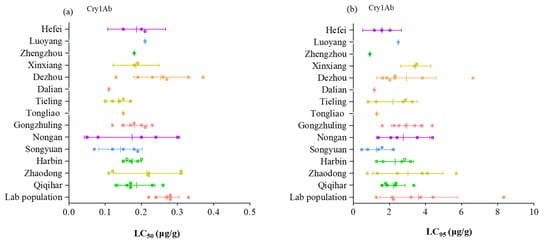 The monitoring results for the corn ecological regions North Spring Corn Region and Huang-Huai-Hai Summer Corn Region are presented in Figure 2. The susceptibility of Cry1Ab to field populations of O. furnacalis collected from the North Spring Corn Region and expressed as LC50 values ranged from 0.12 µg/g (2019) to 0.25 µg/g (2021). When expressed as LC95, values ranged from 1.53 µg/g (2015) to 3.42 µg/g (2017). LC50 and LC95 values of Cry1F ranged from 0.17 µg/g (2016) to 0.65 µg/g (2015) and from 1.79 µg/g (2019) to 6.71 µg/g (2020). For populations collected from the Huang-Huai-Hai Summer Corn Region, LC50 and LC95 values of Cry1Ab ranged from 0.12 µg/g (2020) to 0.27 µg/g (2017) and from 1.59 µg/g (2020) to 4.55 µg/g (2017), respectively; LC50 and LC95 values of Cry1F ranged from 0.17 µg/g (2016) to 0.61 µg/g (2018) and from 2.84 µg/g (2020) to 6.08 µg/g, respectively. In general, the LC50 values of the Huang-Huai-Hai Summer Corn Region field populations were greater than those of the North Spring Corn Region.