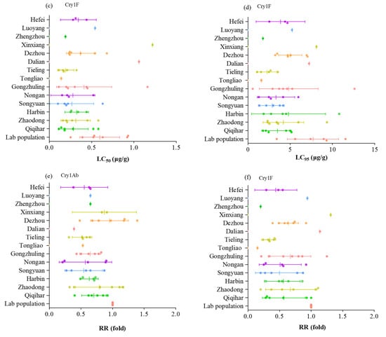 Susceptibility of O. furnacalis neonate larvae to Cry1Ab and Cry1F toxins for the laboratory population and field populations collected in major corn-growing regions from 2015–2021. (a) LC50 values of Cry1Ab to the laboratory population and field populations; (b) LC95 values of Cry1Ab to the laboratory population and field populations; (c) LC50 values of Cry1F to the laboratory population and field populations; (d) LC95 values of Cry1F to the laboratory population and field populations; (e) RR values of Cry1Ab to the laboratory population and field populations at the LC50 level; (f) RR values of Cry1F to the laboratory population and field populations at the LC50 level. Each dot represents one year’s monitoring result.