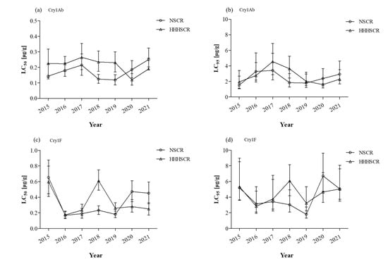 Susceptibility of O. furnacalis neonate larvae to Cry1Ab and Cry1F toxins in the corn ecological regions from 2015–2021. NSCR: North Spring Corn Region; HHHSCR: Huang-Huai-Hai Summer Corn Region. (a) LC50 values of Cry1Ab to NSCR and HHHSCR populations; (b) LC95 values of Cry1Ab to NSCR and HHHSCR populations; (c) LC50 values of Cry1F to NSCR and HHHSCR populations; (d) LC95 values of Cry1F to NSCR and HHHSCR populations.