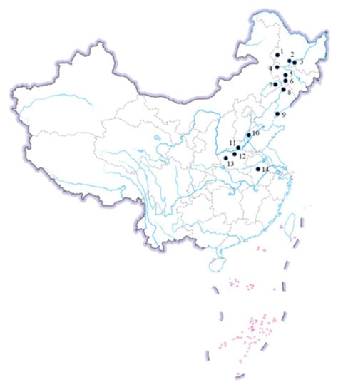 A total of 56 geographical populations of ACB were collected from seven provinces and regions, including Heilongjiang, Jilin, Liaoning, Inner Mongolia, Shandong, Henan, and Anhui, across the North Spring Corn Region and the Huang-Huai-Hai Summer Corn Region (Figure 3 and Table 1). The sampling locations for collecting ACB had very little use of commercial Bt products in corn. Hence, all monitoring data were tested prior to the widespread cultivation of Bt maize varieties, and any potential selection for Bt resistance alleles was rare. At least 100 individuals of fourth to fifth instar larvae were collected by dissecting damaged maize plants at each sampling location and placed individually in tubes containing fresh plant tissue. After being taken to the laboratory, the larvae were reared to the pupal stage on an artificial diet using standardized rearing techniques [38]. Diapausing fifth instar larvae collected in the autumn were treated with Fangjiangfen (a kind of mild fungicide that is used for body surface treatment of bollworm) to reduce the possible infection of pathogens, especially Beauveria bassiana (Bals.) and Bt. The treated larvae were then placed individually into 5-mL tubes (one hole was made in each tube to keep the air circulating) with a piece of plicated paper as a hidden habitat and a piece of wet cotton to supply drinking water [25]. All treated larvae from the same location were packed in a bag and placed outside for 1 to 3 months to terminate diapause, which enabled the larvae to enter post-diapause development and pupate in synchrony [25]. In the next spring, the treated larvae were transferred to 24-well plates with solidified agar. Each well was infected with one larva and a piece of a wet cotton ball (sprayed with water every three days) to supply drinking water. They were then incubated at 27 ± 1 °C, 60–70% RH, and a photoperiod of LD 16:8 h to allow pupation. As the pupation of larvae terminating diapause sometimes did not synchronize very well, one, two, or more generations were necessary to provide a sufficient number of individuals for bioassay.
