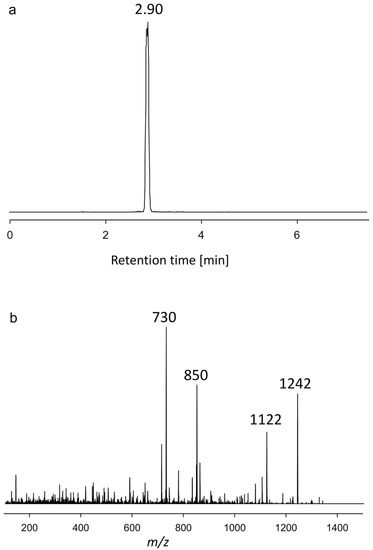 (a) Chromatogram showing the retention time. (b) Collision-induced dissociation (CID) spectrum of m/z 1242 (2.90 min) of the strain AxSQ175, named U1.