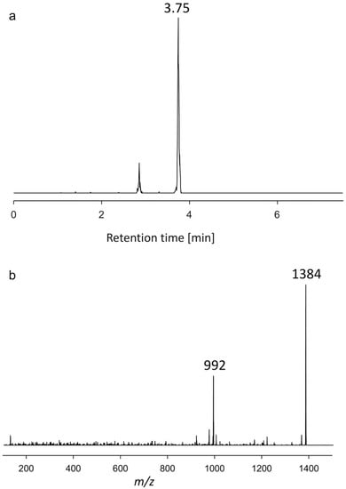 (a) Chromatogram showing the retention time. (b) Collision-induced dissociation (CID) spectrum of m/z 1384 (3.75 min) of the strain AA60, named U2.