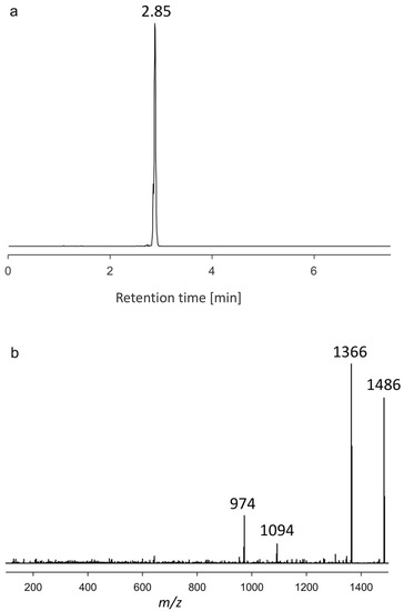(a) Chromatogram showing the retention time. (b) Collision-induced dissociation (CID) spectrum of m/z 1486 (2.85 min) of the strain AA60, named U3.