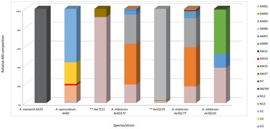 The novel AMs were detected in the middle (U2 and U3) and high (U1) fg cell−1 range, representing a significant fraction of the total AM profiles. In the case of the strain AxSQ175, compound U1 was the main AM that represented more than 95% of the total AM profile, indicating that the structural variability of AMs has not yet been fully explored.