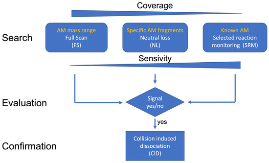 Conceptual model of the analytical approach of the detection of potential new AMs and flow chart of the applied MS/MS modes.