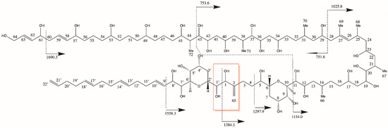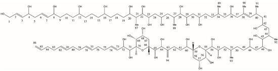 A common feature among all AMs is a bond cleavage between two vicinal hydroxyl groups near tetrahydropyran ring B in the conserved central part of the molecules, separating AMs into the hydrophilic and lipophilic parts. With carbon numbering starting at the end of the molecule according to the IUPAC (Figure 8), the C numbers at the conserved cleavage site would depend on the carbon number of the hydrophilic parts of the molecules, and thus, result in different numbers across different AMs. To identify and visualize similarities and differences between lipophilic and hydrophilic parts of AMs, a numbering starting at both sides of the cleavage site has been proposed, where C-1′ to C n’ denominates the lipophilic part and C-1 to C-n the hydrophilic part of AMs [17] (Figure 9).