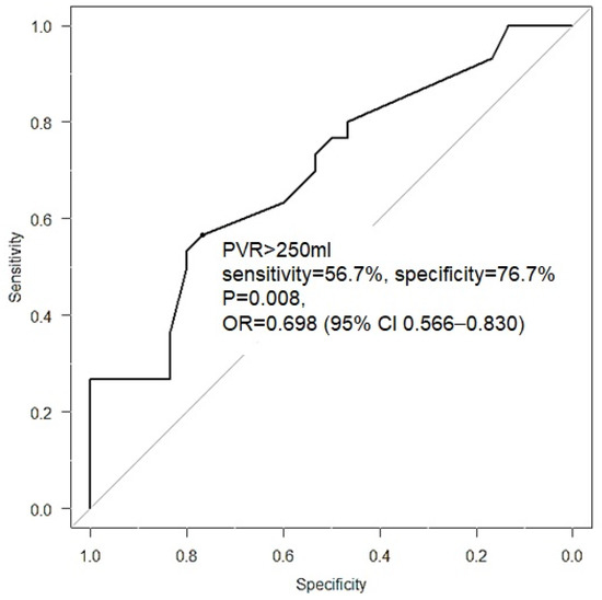 Receiver operating characteristic analysis of the baseline post-void residual (PVR) volume in patients with detrusor underactivity.